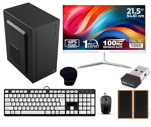 The system includes a 21.5-inch Full HD monitor that offers a sharp 1080p resolution for clear and vibrant visuals. With a 100Hz refresh rate and 1ms MPRT response time, it ensures smoother motion and reduced blur, making it suitable for both productivity and casual gaming. The WPS panel enhances color consistency and viewing comfort.