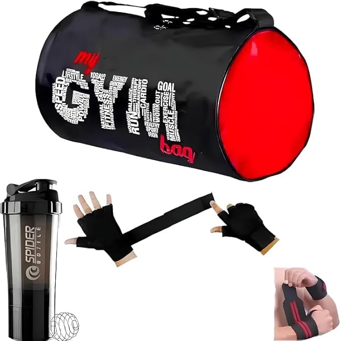 KT Gym Bag Set with Spider Bottle Protein Shaker, Gym Gloves, Wrist Support Wraps, Black and Red