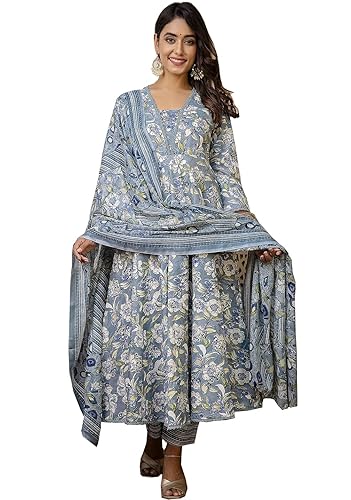 PARTHVI Women's Printed Cotton Anarkali Kurta & Pant With Dupatta Set
